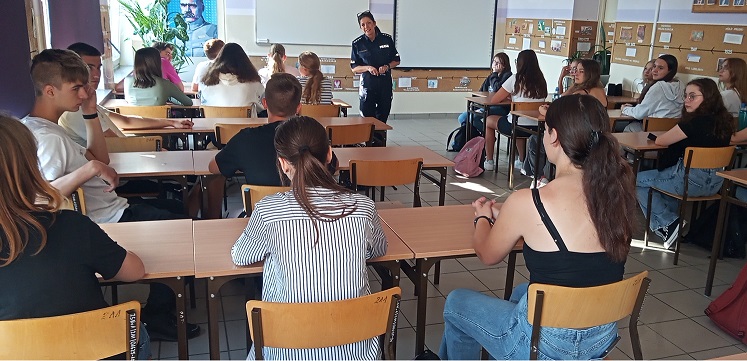 spotkanie policjantki z uczniami szkoły ponadpodstawowej -