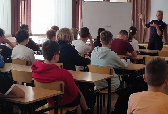 Policjantka ds. nieletnich i patologii omówiła uczestnikom najczęściej popełniane czyny zabronione przez osoby nieletnie i zachowania mogące świadczyć o demoralizacji wskazując na konsekwencje prawne takich zachowań. Przestrzegła również przed publikowaniem niedozwolonych treści i materiałów w sieci oraz niewłaściwym zachowaniem w cyberprzestrzeni.