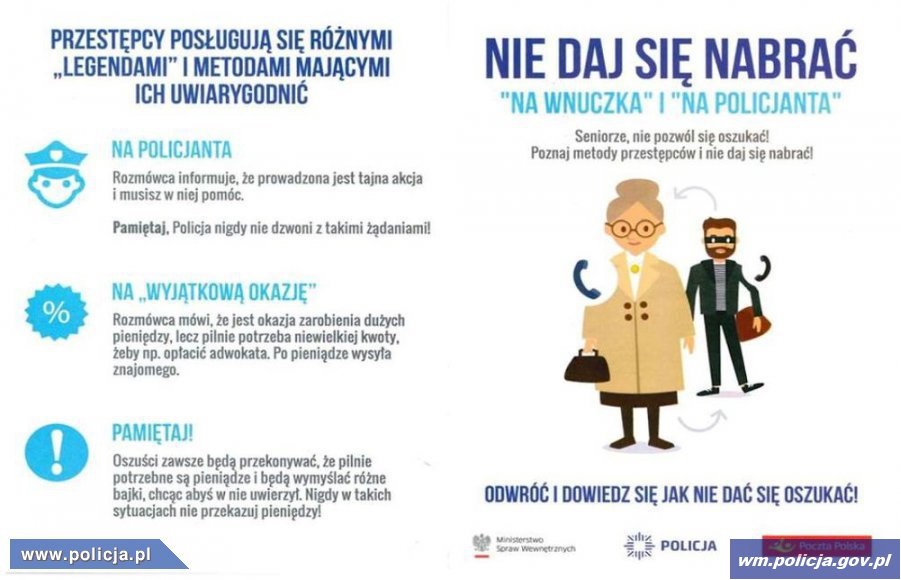 W kilku ostatnich latach seniorzy najczęściej padali ofiarami kradzieży i oszustw. Przestępcy wykorzystują łatwowierność i obniżony poziom czujności starszych i samotnych osób. Jednym z najczęściej popełnianych przestępstw na szkodę osób starszych jest oszustwo dokonywane metodami „na wnuczka” i „na policjanta”. Jest ono szczególnie dotkliwe, ponieważ bardzo często seniorzy w wyniku działania oszustów tracą oszczędności całego życia.
