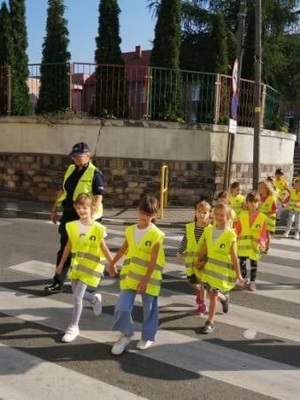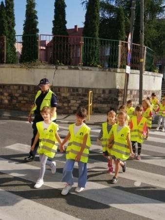 Pierwszoklasiści z zainteresowaniem wysłuchali pogadanki aktywnie uczestnicząc w ćwiczeniu zasad brd na przejściu dla pieszych.