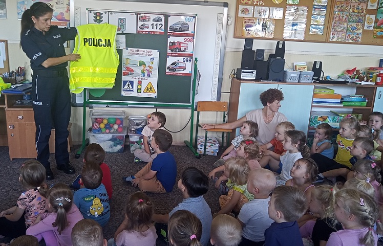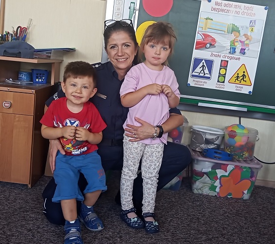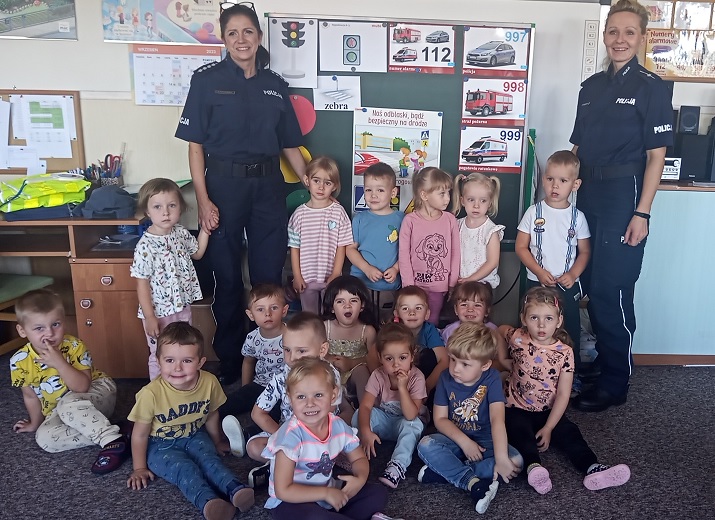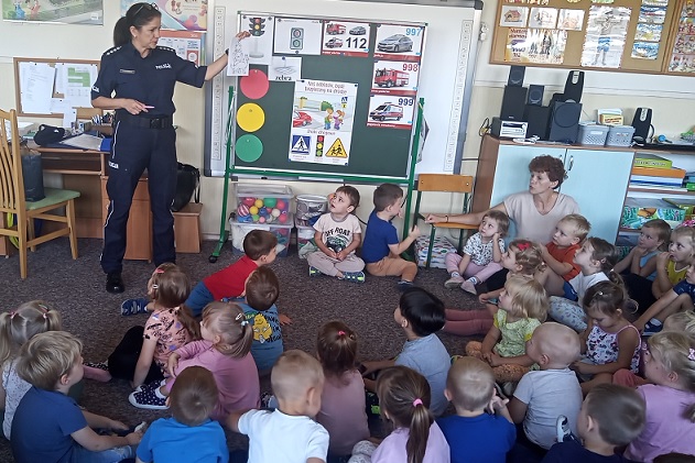 W czwartek (28.09.2023r.) policjantki z Komendy Powiatowej Policji w Działdowie odwiedziły wychowanków z przedszkola na ulicy Grunwaldzkiej w Działdowie, by przypomnieć im i przedstawić podstawowe zasady bezpieczeństwa na ulicy, w domu oraz przedszkolu. Najmłodsi z uwagą słuchali wskazówek i uwag funkcjonariuszek policji. Na przykładzie obrazków i pytań kierowanych do dzieci, policjantka ds. nieletnich przypomniała maluchom jak zachować się na przejściu z sygnalizacją świetlną i uczuliła na zagrożenia związane z poruszaniem się po drodze. Zwróciła uwagę na zasady bezpiecznego podróżowania w samochodzie i przypomniała o roli elementów odblaskowych podczas poruszania się po drodze. Ponadto, przestrzegła dzieci przed rozmową i kontaktem z osobami obcymi i nieznajomymi oraz unikania kontaktu z biegającymi luzem zwierzętami. Podczas spotkania 3 i 4 – latki mogły przymierzyć policyjną kamizelkę odblaskową i zapoznać się z tarczą do zatrzymywania pojazdów. Dzieci dowiedziały się również jak korzystać z numerów alarmowych.