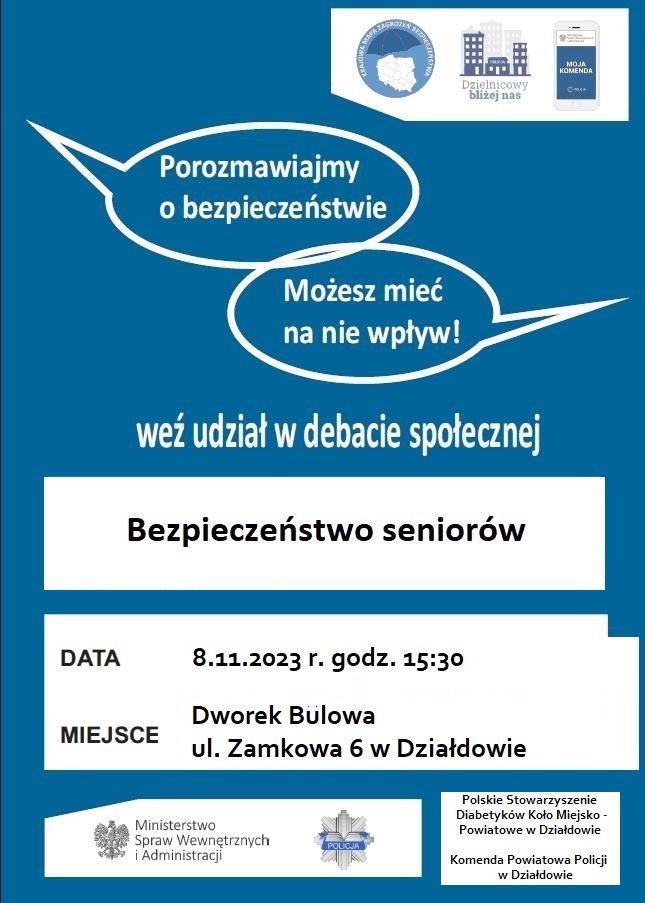 Już niebawem odbędzie się debata społeczna poświęcona bezpieczeństwu seniorów. Organizatorami debaty jest Polskie Stowarzyszenie Diabetyków Koło Miejsko-Powiatowe w Działdowie i Komenda Powiatowa Policji w Działdowie. Wszystkich mieszkańców zapraszamy do udziału w spotkaniu.