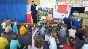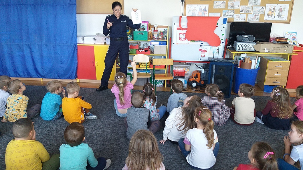 Grupa 5-latków z Przedszkola nr 1 w Działdowie uczestniczyła w spotkaniu z policjantkami z Komendy Powiatowej Policji w Działdowie. Funkcjonariuszki zostały zaproszone do dzieci, by porozmawiać z nimi na temat bezpiecznej drogi do i z przedszkola. Policjantka ds. nieletnich i patologii omówiła zasady prawidłowego przechodzenia przez jezdnię po przejściu dla pieszych z sygnalizacją świetlna i bez sygnalizacji. Dzieci dowiedziały się, a część przypomniała sobie, co oznacza światło czerwone „STOP” i o czym informuje oraz światło zielone „IDŹ” dla pieszych, a co dodatkowo oznacza światło barwy żółtej „PRZYGOTUJ SIĘ” w sygnalizatorze dla kierujących pojazdami.
