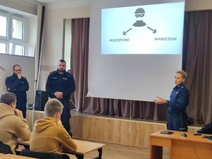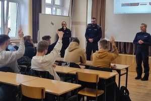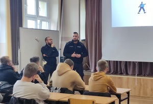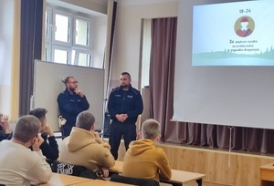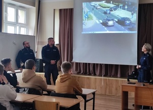 Policjanci Ogniwa Ruchu Drogowego w Działdowie wspólnie z oficerem prasowym i policjantką zajmującą się problematyką nieletnich udali się do Technikum na Grunwaldzkiej w Działdowie, gdzie spotkali się z uczniami klas czwartych na zaproszenie wychowawcy jednej z klas. W czasie rozmowy z młodzieżą w czwartek (16.11.2023 r.) funkcjonariusze przekazali treści w zakresie przepisów dotyczących kierujących pojazdami, odpowiedzialności za popełniane wykroczenia i przestępstwa drogowe oraz uświadomili ją o danych dotyczących wypadków i zdarzeń drogowych z udziałem młodych kierowców. Na spotkaniu uczestnikom przypomniano przepisy dotyczące obowiązków pieszych i kierujących po zmianach przepisów po 1 czerwca 2021 r. oraz wskazano na zagrożenia uczestników ruchu drogowego w roli pieszego, rowerzysty czy kierowcy. Młodzież obejrzała spoty „Przejście dla pieszych” i „Nie lekceważ znaków na swojej drodze. Zwolnij!”. Policjanci apelowali do młodych kierujących o przestrzeganie przepisów bezpieczeństwa w ruchu drogowym i ostrożną jazdę. Przy okazji spotkania policjanci poruszyli temat doboru i rekrutacji do Policji oraz warunków, jakie musi spełniać kandydat ubiegający się o przyjęcie do służby zachęcając młodzież do wstąpienia w swoje szeregi. Uczestników spotkania poinformowano również o możliwości podjęcia studiów w Akademii Policji w Szczytnie na kierunku Nauka o Policji.