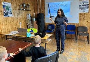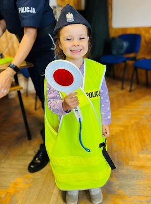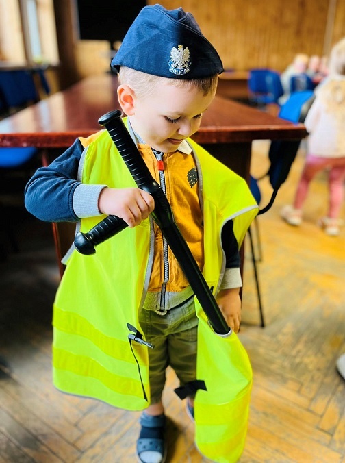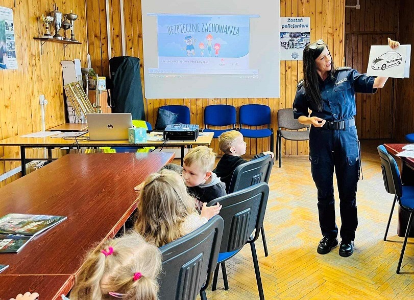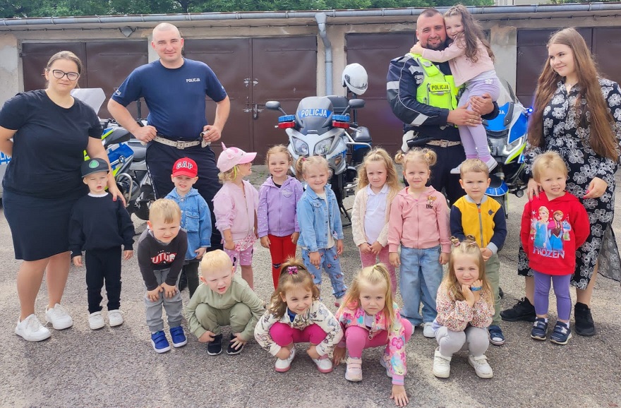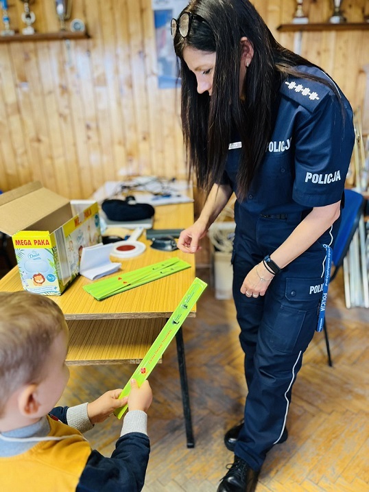 Wizyta w jednostce policji była dużą niespodzianką dla maluchów. Grupa przedszkolaków zapoznała się z zaprezentowanym sprzętem policyjnym wykorzystywanym podczas służby. Ochotnicy mogli przymierzyć elementy umundurowania funkcjonariuszy, przez co, choć przez chwilę mogli poczuć się jak prawdziwi policjanci. Podczas spotkania dzieci przypomniały sobie zasady poruszania się po jezdni, jak również zasady bezpiecznego zachowania na drodze i w podróży czy w kontakcie z obcym podczas prezentacji filmu profilaktyczno-edukacyjnego z policjantem Poli. Dzieci dla utrwalenia omawianych treści otrzymały kolorowanki tematyczne, a na zakończenie spotkania w świetlicy policjantka przekazała dzieciom opaski odblaskowe i odznaki „Małego Policjanta”.