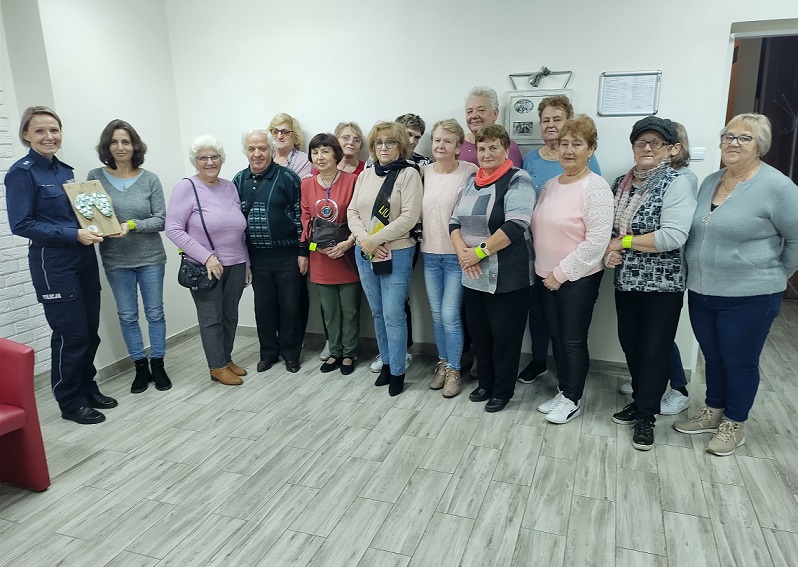 Spotkanie policjantek z Działdowa z seniorami z gminy Płośnica. Policjantki przekazywały wiedzę na temat działalności przestępców i zagrożeń w Internecie, by podnieść świadomość seniorów i uchronić ich przed oszustami. W trosce o bezpieczeństwo na drodze funkcjonariuszki przekazały seniorom odblaski.