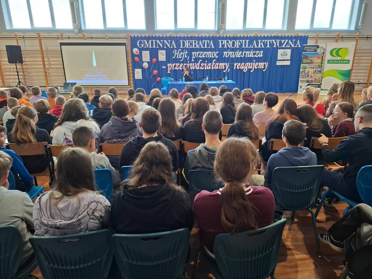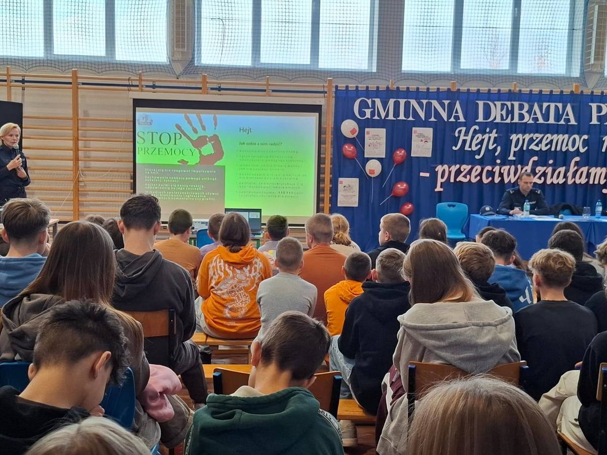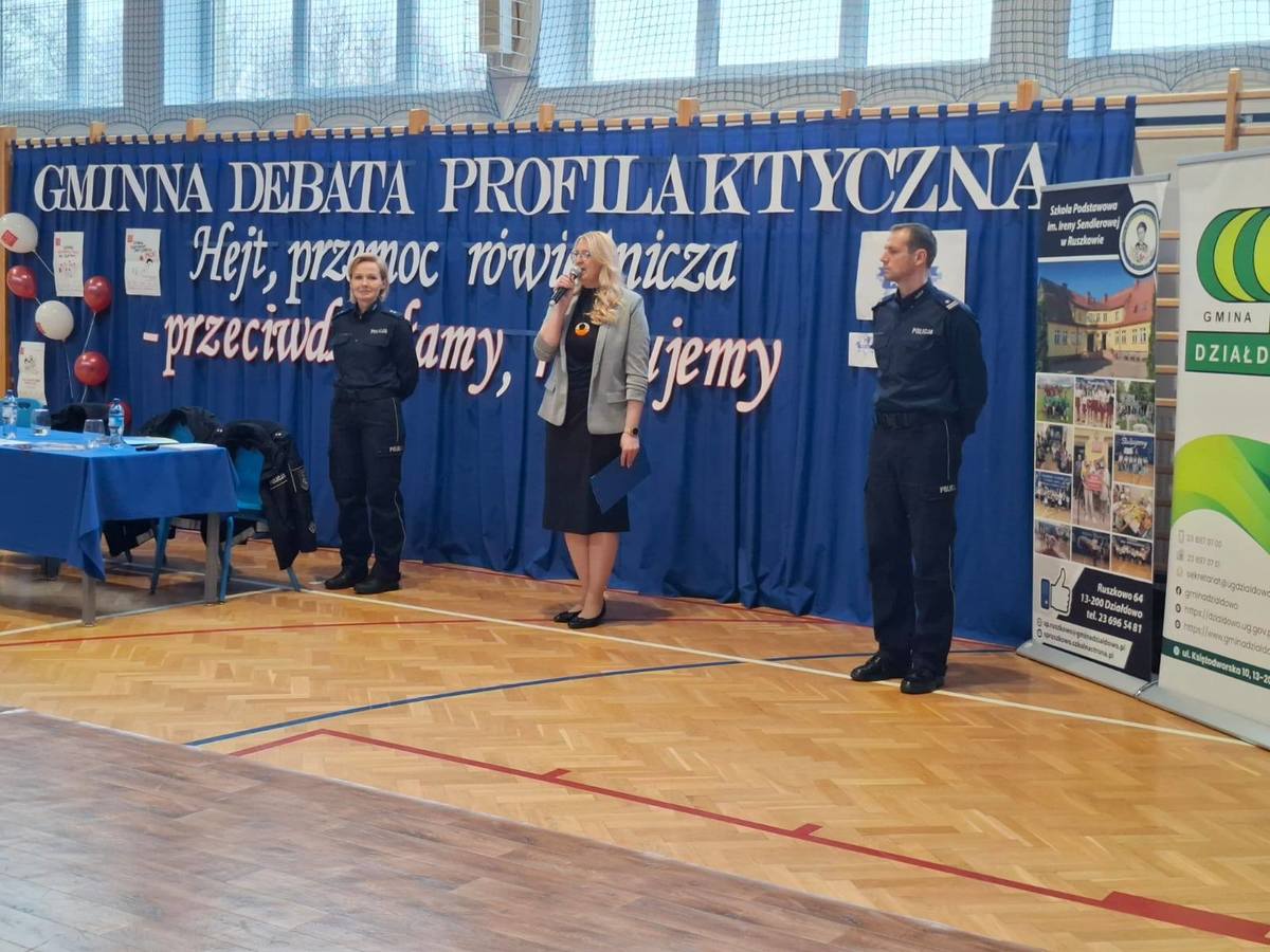 W środę 19 listopada na finał kampanii „Dzieciństwo bez przemocy” oraz w Międzynarodowy Dzień Przeciwdziałania Przemocy wobec Dzieci policjanci z Komendy Powiatowej Policji w Działdowie wspólnie ze Szkołą Podstawową im. Ireny Sendlerowej w Ruszkowie przeprowadzili debatę społeczną pod hasłem „Hejt, przemoc rówieśnicza – przeciwdziałamy, reagujemy”. Uczestnikami wydarzenia byli uczniowie z sześciu szkół podstawowych z terenu gminy Działdowo. Udział w debacie wzięły również przedstawicielki Wydziału Oświaty z Urzędu Gminy w Działdowie.