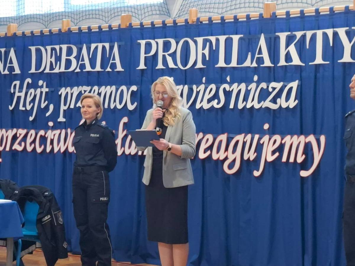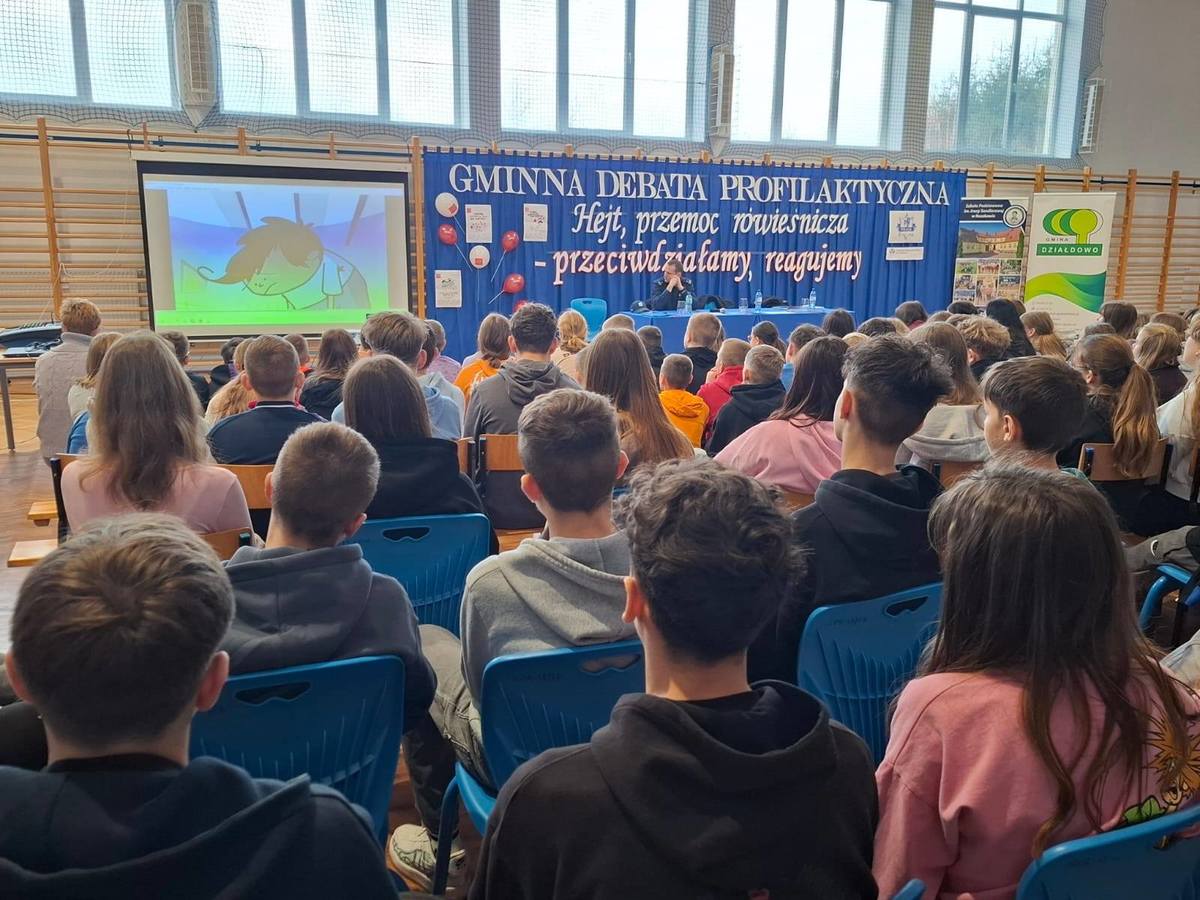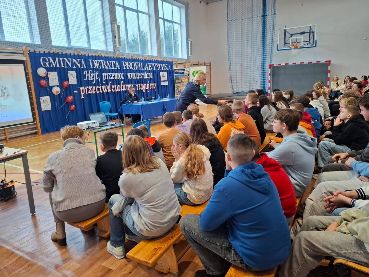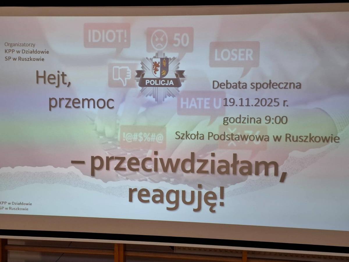 W środę 19 listopada na finał kampanii „Dzieciństwo bez przemocy” oraz w Międzynarodowy Dzień Przeciwdziałania Przemocy wobec Dzieci policjanci z Komendy Powiatowej Policji w Działdowie wspólnie ze Szkołą Podstawową im. Ireny Sendlerowej w Ruszkowie przeprowadzili debatę społeczną pod hasłem „Hejt, przemoc rówieśnicza – przeciwdziałamy, reagujemy”. Uczestnikami wydarzenia byli uczniowie z sześciu szkół podstawowych z terenu gminy Działdowo. Udział w debacie wzięły również przedstawicielki Wydziału Oświaty z Urzędu Gminy w Działdowie.