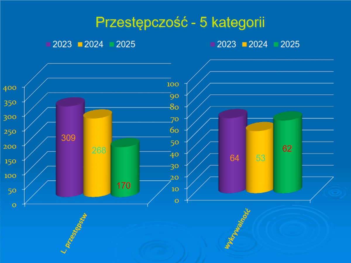 Zmalała nieznacznie liczba wszystkich przestępstw stwierdzonych w stosunku do roku 2024 ze 1016 do 1007 przestępstw, a także przestępstw kryminalnych z liczby 525 w roku 2024 do 508 przestępstw w roku 2025.