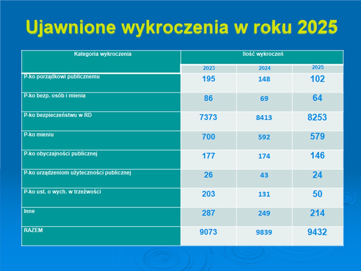 Policjanci ujawnili 9432 wykroczenia w roku 2025, z czego 8253 dotyczyło wykroczeń popełnionych w ruchu drogowym, a 579 przeciwko mieniu (najczęściej były to kradzieże) (tabela 3).