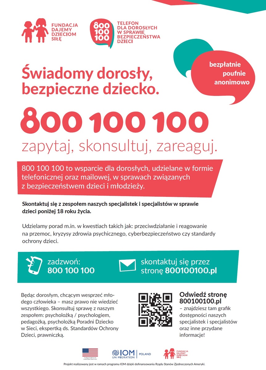 800 100 100 to doraźna, bezpłatna i anonimowa pomoc telefoniczna i online dla dorosłych w sprawie bezpieczeństwa dzieci poniżej 18 roku życia.