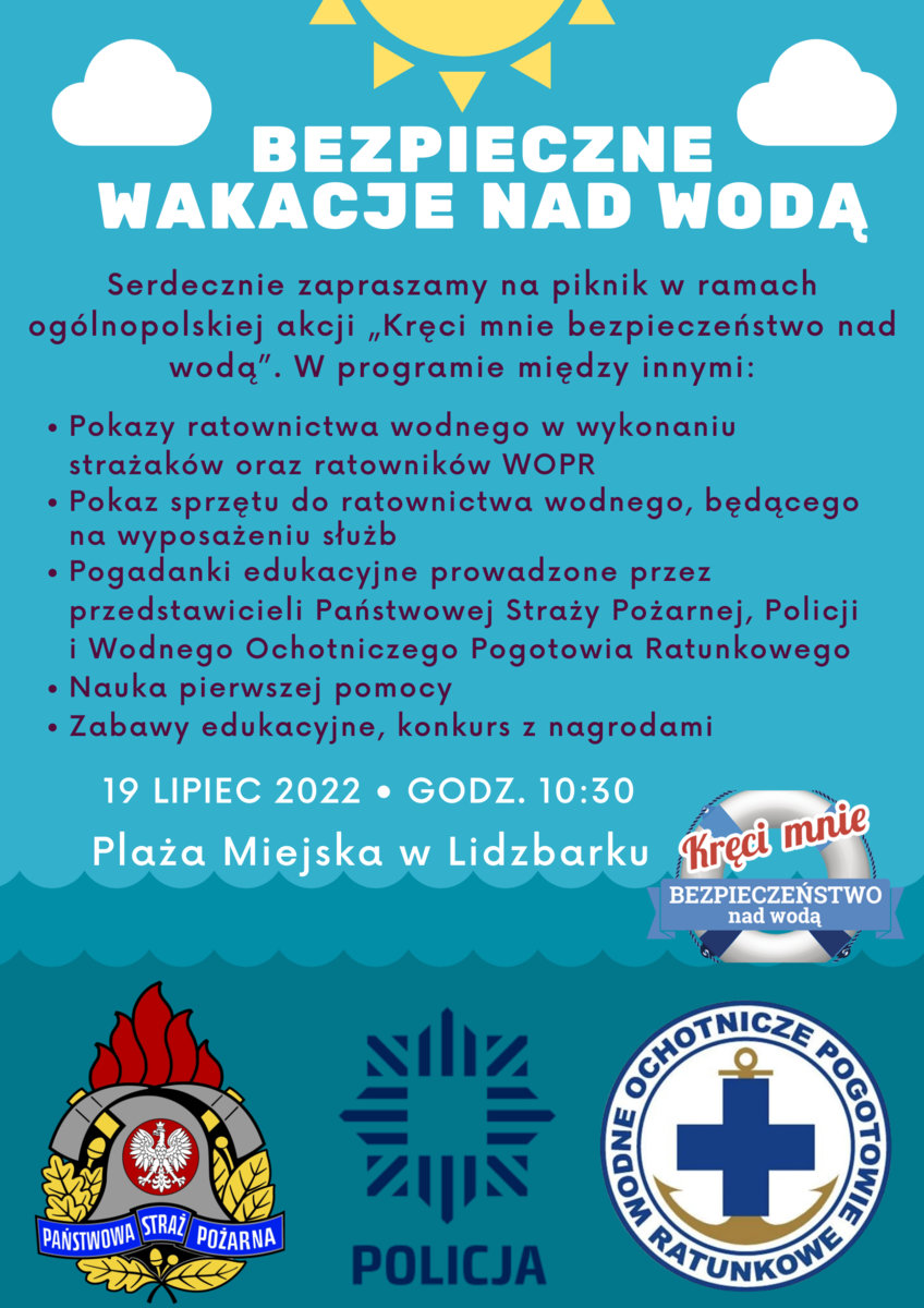 Policja, Straż Pożarna i WOPR zapraszają na piknik pod hasłem "Kręci mnie bezpieczeństwo nad wodą". W programie wiele atrakcji, w tym pokazy strażaków, ratownictwa, pogadanki, konkurs z nagrodami. Zabawa rusza o godzinie 10.30 w dniu 19 lipca 2022 r. na plaży nad jeziorem w Lidzbarku.