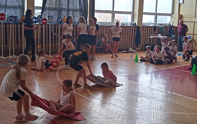 W piątek (28.10.2022 r.) w Szkole Podstawowej nr 3 w Działdowie odbył się Miejski konkurs wiedzy o ruchu drogowym „Jestem sprawny i bezpieczny”. W zmaganiach brały udział cztery drużyny składające się z 10 osób – uczniów klas pierwszych uczęszczających do szkół podstawowych z terenu miasta Działdowa. Dzieci wspierane dopingiem opiekunów bardzo aktywnie uczestniczyły w konkurencjach sportowych i teoretycznych wymagających wiedzy z zakresu ruchu drogowego. Zawodnicy mieli m.in. do pokonania slalomem tor z ustawionymi znakami drogowymi, gdzie trzymając tarczę STOP w ręku musiały przełożyć przez siebie szarfę, wrócić na pole startu i przekazać „lizak” kolejnemu zawodnikowi z drużyny. W innej konkurencji dzieci musiały kolejno ułożyć szablony w kolorze czarnym i białym tworząc tzw. zebrę, czyli pasy na przejściu dla pieszych, a w następnej konkurencji prawidłowo przejść po tych pasach. Bardzo dużo humoru, ale i zaangażowania fizycznego zawodników przyniosła konkurencja związana z przewożeniem w parach każdej z osób na kocu służącym za pojazd czy układania puzzli z pojazdami uprzywilejowanymi z rozsypanki i przyporządkowania właściwego im numeru alarmowego. Dzieci uczestniczyły również w konkurencjach z pytaniami, gdzie należało wykazać się wiedzą podczas kolorowania sygnalizacji świetlnej, wskazania spośród kilkunastu szablonów zachowań właściwych i nieprawidłowych czy odpowiadając na pytania z przepisów bezpieczeństwa w ruchu drogowym podnosząc tabliczkę oznaczającą prawidłową odpowiedź.