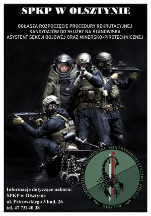 Komendant Wojewódzki Policji w Olsztynie ogłasza rozpoczęcie postępowania kwalifikacyjnego dla kandydatów do służby w Samodzielnym Pododdziale Kontrterrorystycznym Policji w Olsztynie, w komórce właściwej w sprawach prowadzenia działań bojowych. Jednocześnie Dowódca Samodzielnego Pododdziału Kontrterrorystycznego Policji w Olsztynie ogłasza nabór dla funkcjonariuszy na stanowiska w Sekcji Bojowej i Sekcji Minersko-Pirotechnicznej.