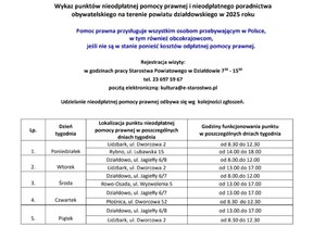 Na stronie Starostwa Powiatowego w Działdowie mogą Państwo dowiedzieć się, gdzie skorzystać z nieodpłatnej pomocy prawnej w naszym powiecie. Informacje o punktach i godzinach dostępności znajdziecie poniżej.